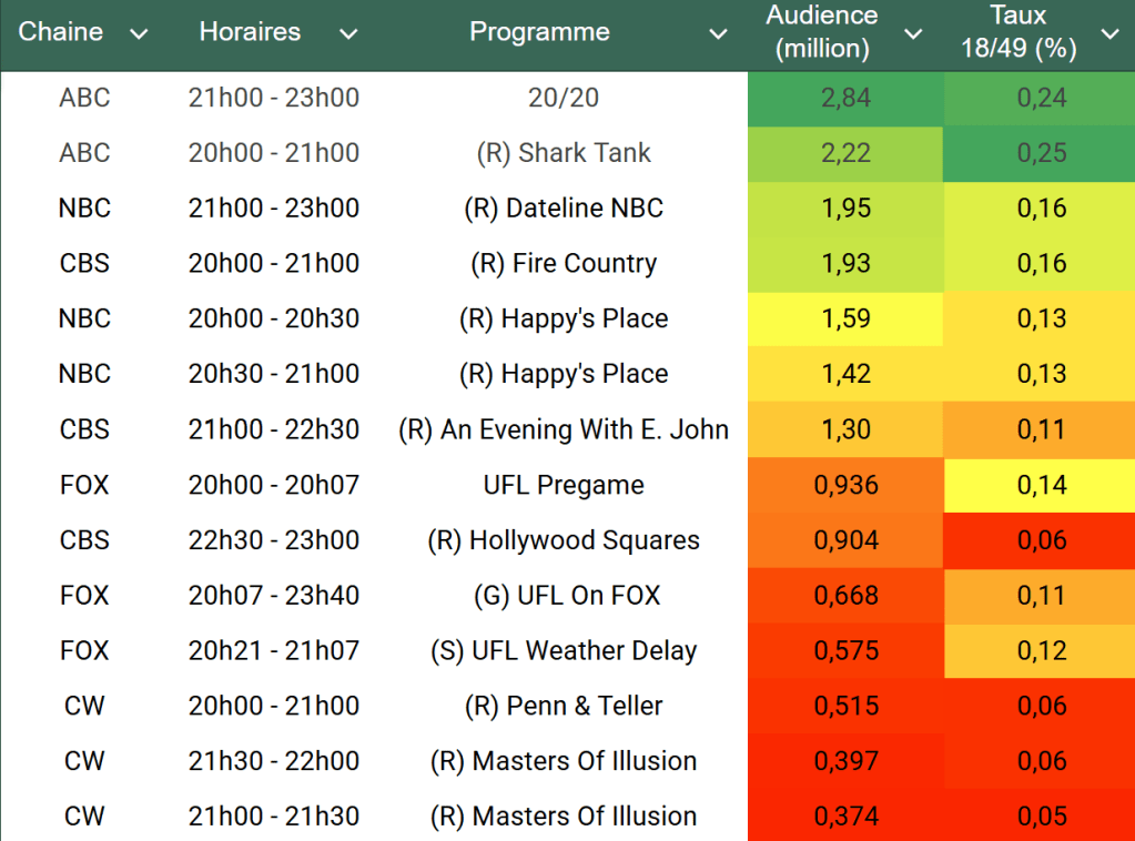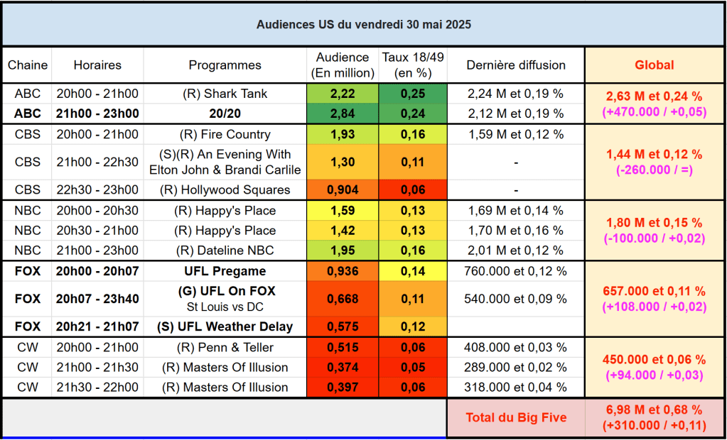 Audiences US du Vendredi 30.05.25 : 20/20 leader en bonne forme. Hollywood Squares sous le million en rediff. FOX progresse un peu avec UFL. Thomas Fusil Communiqués Audiences US 4 juin 2025 1 Minute Voici les audiences de la soirée du 30 Mai Audiences triées (téléspectateurs) Partager : Partager sur X(ouvre dans une nouvelle fenêtre) X Partager sur Facebook(ouvre dans une nouvelle fenêtre) Facebook J’aime chargement… Similaire Publié par Thomas Fusil Voir tous les articles par Thomas Fusil Publié 4 juin 2025