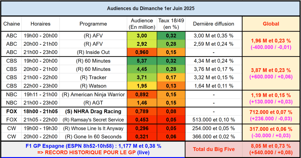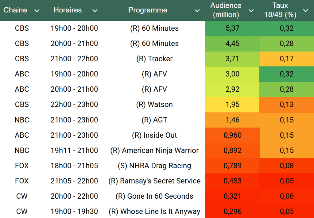 Audiences US du Dimanche 01.06.25 : 60 Minutes, en forte hausse, domine très largement sur CBS. Tracker progresse également. AFV stable. NBC et FOX faibles. Thomas Fusil Communiqués Audiences US 5 juin 2025 1 Minute Voici les audiences du 1er Juin Audiences triées (téléspectateurs) Partager : Partager sur X(ouvre dans une nouvelle fenêtre) X Partager sur Facebook(ouvre dans une nouvelle fenêtre) Facebook J’aime chargement… Similaire Publié par Thomas Fusil Voir tous les articles par Thomas Fusil Publié 5 juin 2025