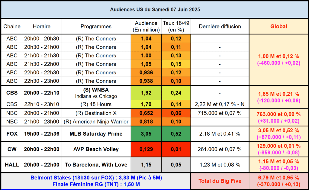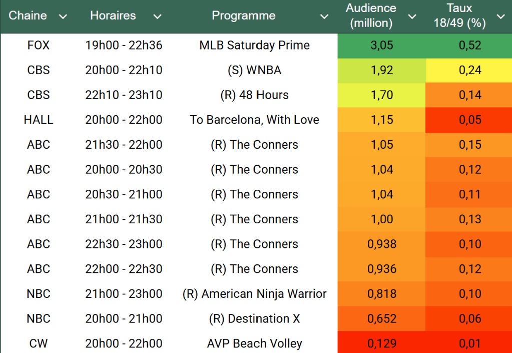 Audiences US du Samedi 07.06.25 : Gros carton pour le baseball, au plus haut depuis 2018 sur FOX ! CBS s’en sort bien avec le basket féminin. Toujours une catastrophe pour NBC.