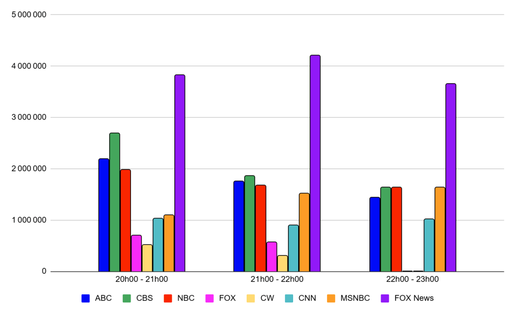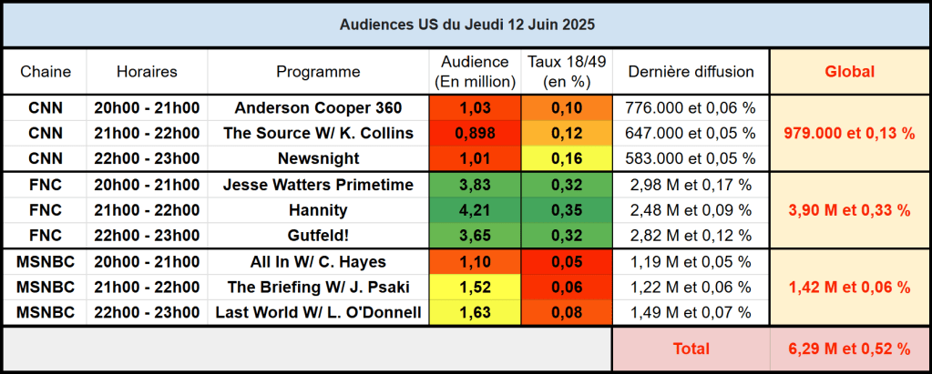 Audiences Chaines Info du 12 Juin : FOX News en très forte hausse, portée par l’actualité internationale et se classe même leader national. CNN frôle le million sur la soirée. MSNBC faible sur cible.