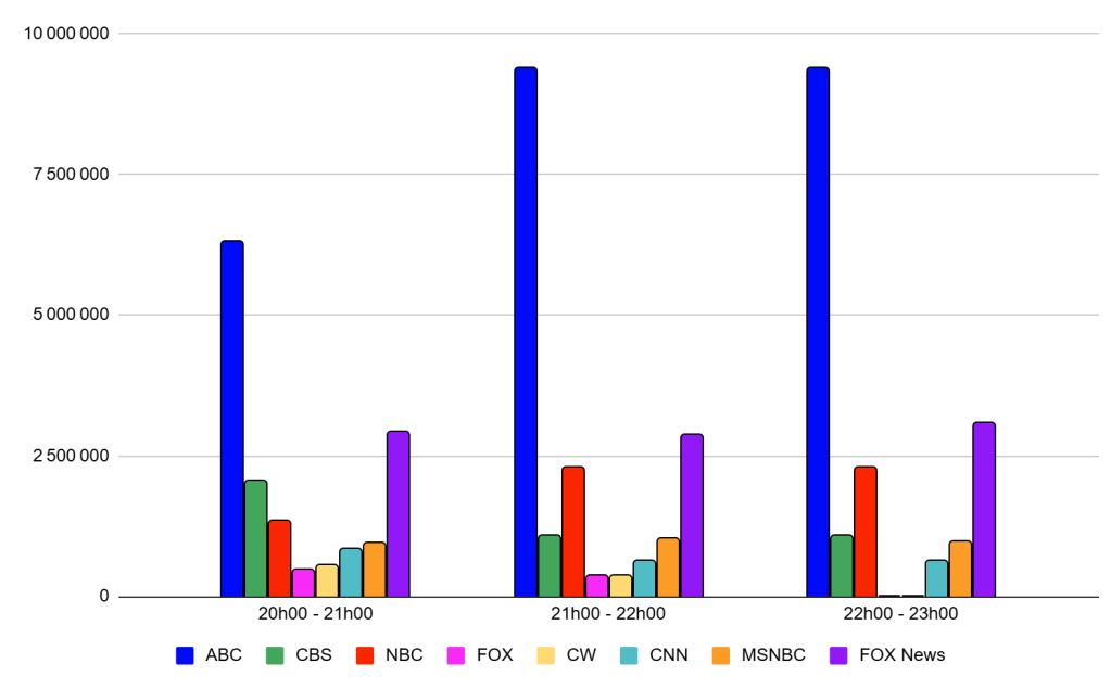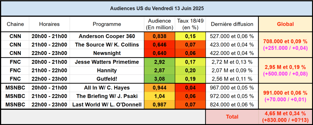 Audiences Chaines Info : FOX News toujours puissante et en forte hausse sur une semaine. CNN en progression par rapport à vendredi dernier, mais reste derrière MSNBC, toutes les deux sous le million.