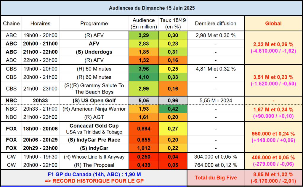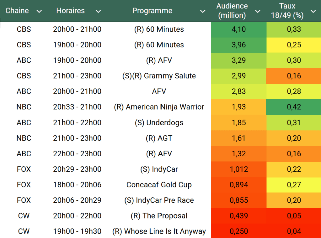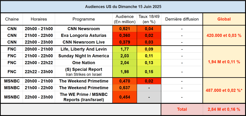 Audiences chaines info : FOX News ne laisse aucune chance à la concurrence. CNN et MSNBC en difficulté le dimanche avec parfois des doc ou des rediffs.