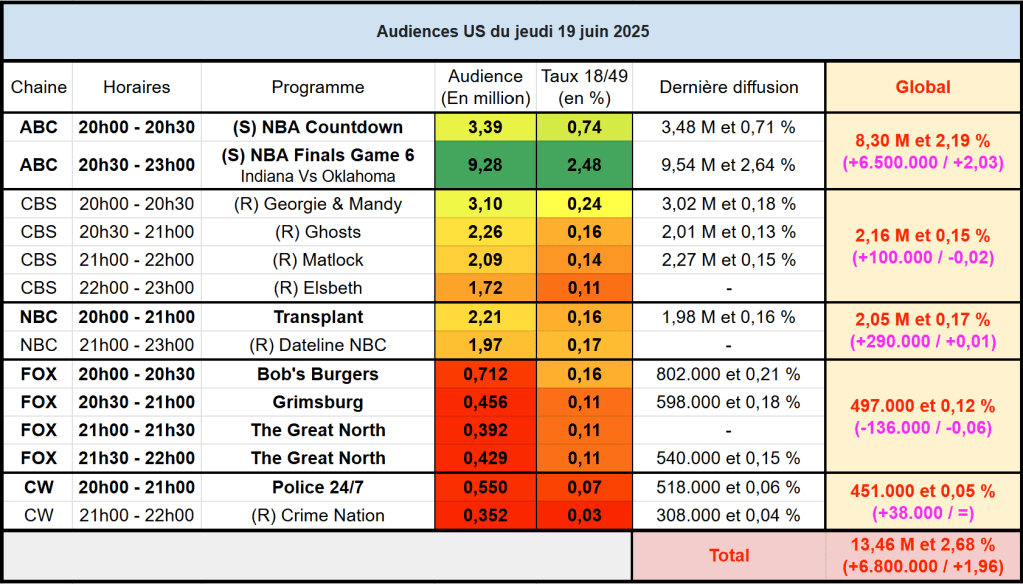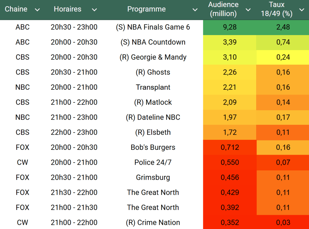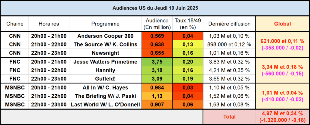 Audiences des chaines info : Avec une actualité moins forte que la semaine dernière (début du conflit Israël/Iran), les 3 chaines infos sont en nette baisse. FOX New domine toujours largement. CNN s’en sort sur cible de 21h à 23h mais reste faible en téléspectateurs.