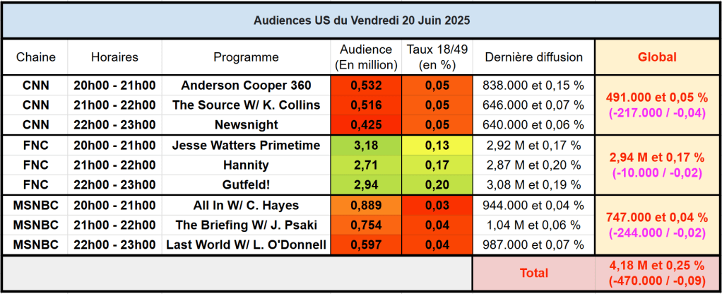 Audiences des chaines info : FOX News large leader, dépasse les 3 millions avec Jesse Watters. CNN et MSNBC faibles sur tous les critères.