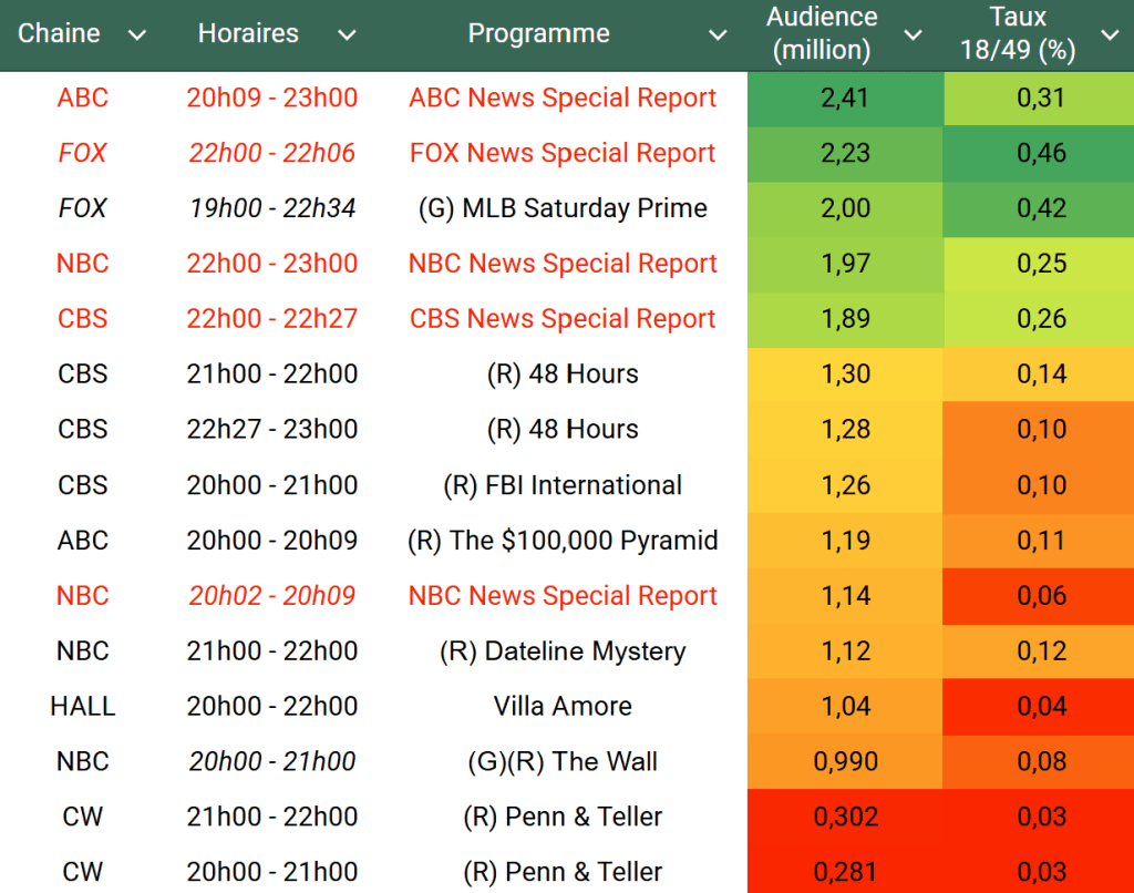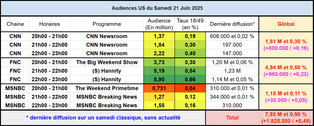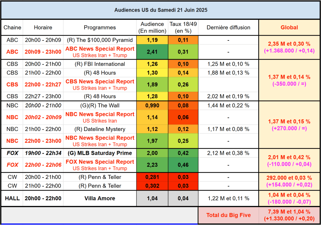 Audiences US chaines info : La très forte actualité avec les Etats-Unis qui frappent l’Iran booste énormément FOX News et CNN. FOX News est très puissante, frôlant même les 6M de 22h à 23h, créneau ou Donald Trump s’est exprimé. CNN également en très grande forme, dépassant les 2M à 22h. MSNBC est battu par CNN et signe une faible hausse sur une semaine (actualité déjà chargée la semaine dernière avec la parade de Trump et les manifestations).