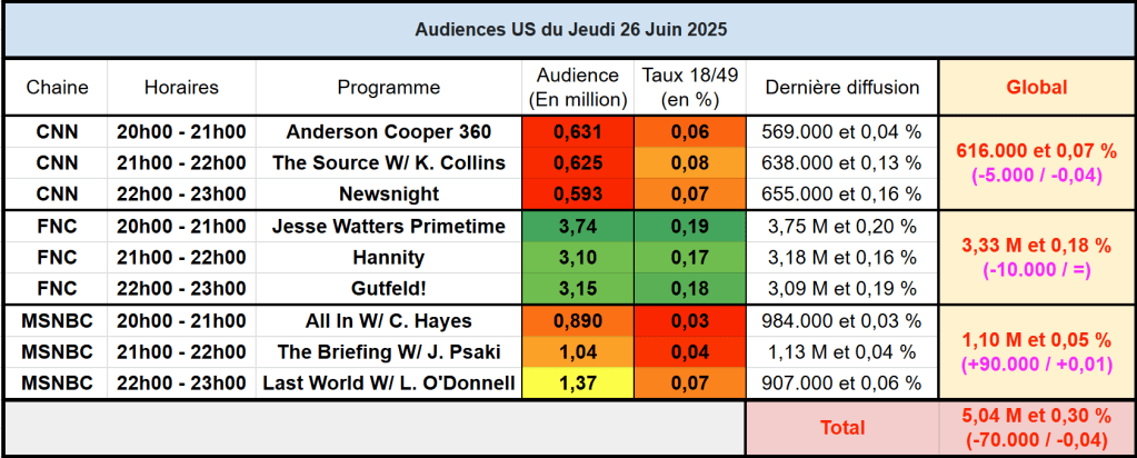 Audiences chaines info : Nouveau succès pour Jesse Watters, qui se classe leader national. Les chaines info sont globalement stable ce jeudi.