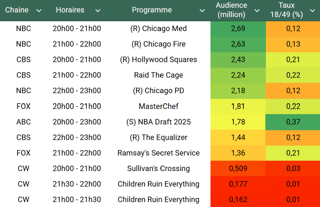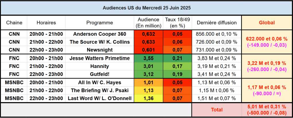 Audiences chaines info : Jesse Watters domine toujours les débats. Les trois chaines sont en baisse. CNN et MSNBC au coude à coude sur cible, la deuxième nettement devant en téléspectateurs.
