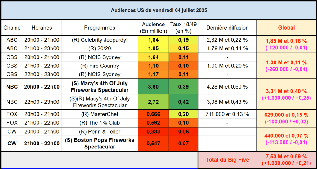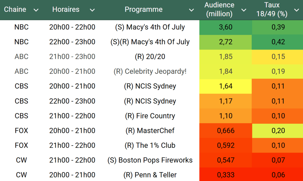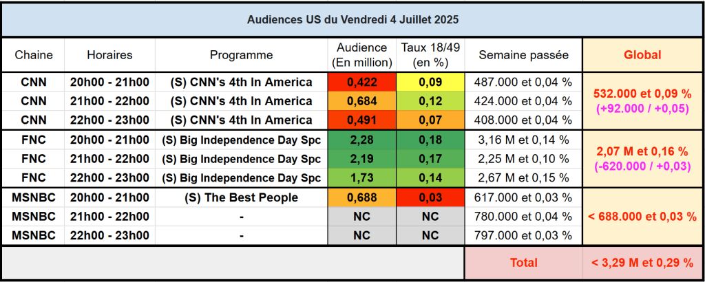 Audiences chaines infos : Programmation spéciale en ce jour de fête nationale. FOX News domine largement. CNN s’en sort bien, notamment sur cible.
