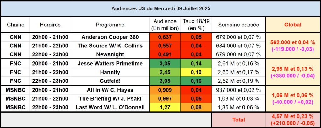 Audiences des chaines infos : Jesse Watters Primetime intouchable. FOX News leader sans aucune menace à proximité. CNN sous les 600k. MNSBC deux fois sous le million.