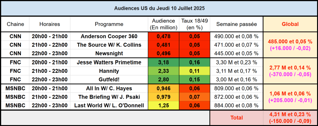 Audiences des chaines infos : Jesse Watters Primetime toujours le seul programme au dessus des 3 millions. Hannity en très forte baisse. MSNBC devant CNN sur cible.