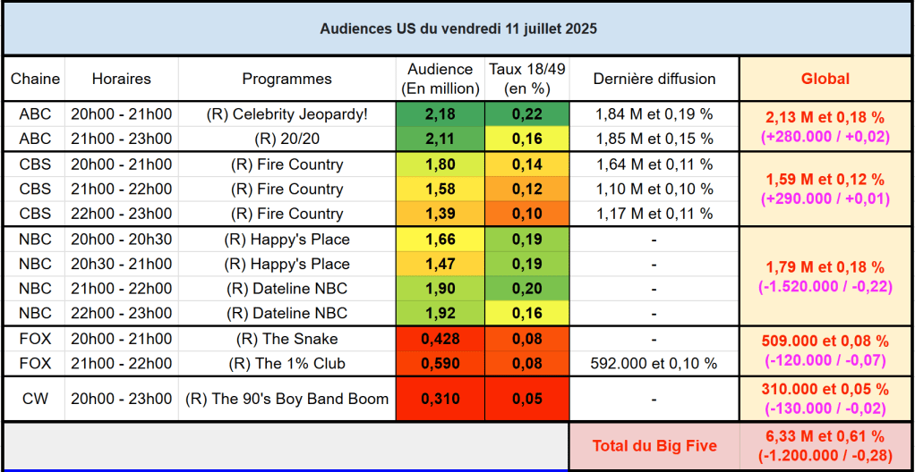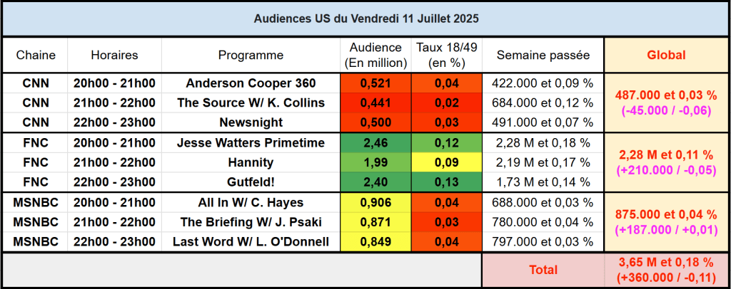 Audiences des chaines infos : FOX News leader en hausse. CNN sous les 500k. MSNBC remonte après un 4 Juillet compliqué.