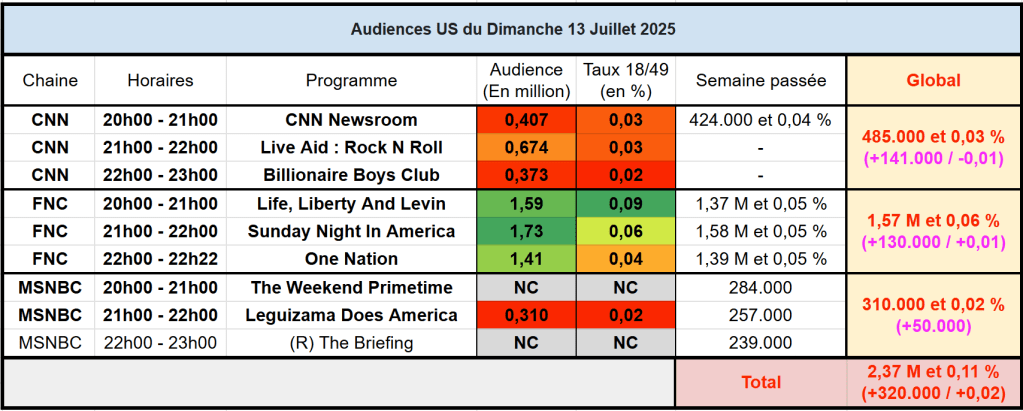 Audiences des chaines infos : FOX News leader sans difficulté. Sunday Night In American dépasse même les 1,7M à 21h.