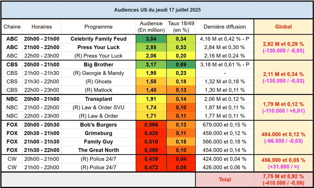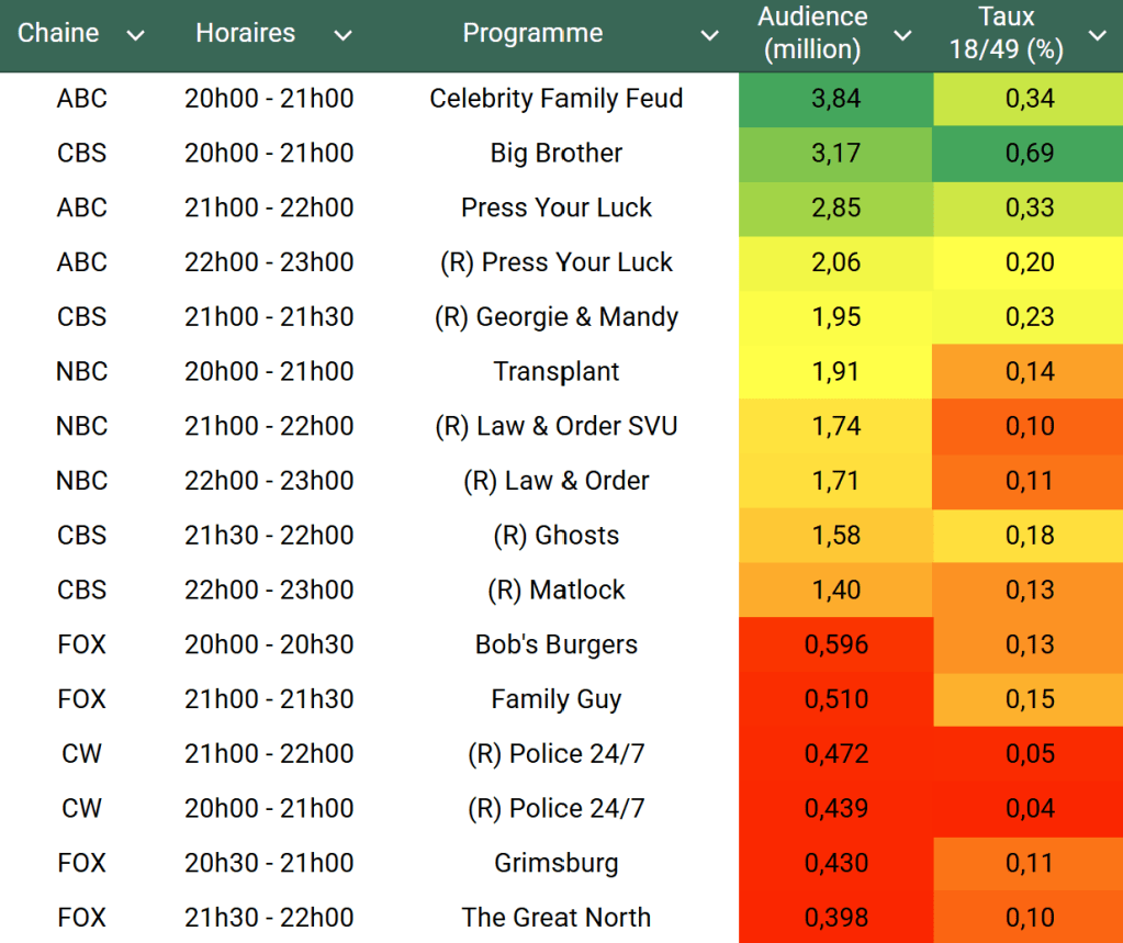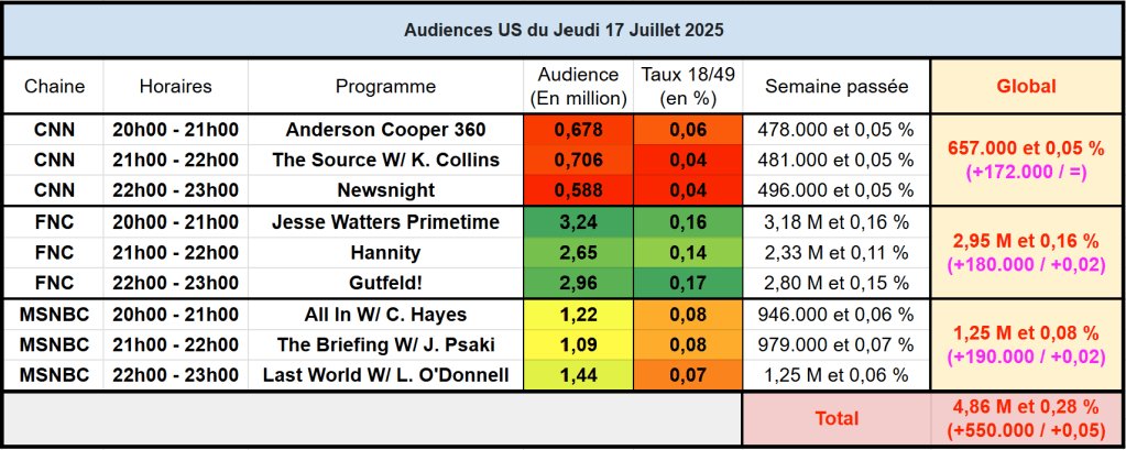 Audiences des chaines infos : Les scandales politiques de Donald Trump boostent les chaines infos. CNN dépasse les 700k à 21h et gagne 172k sur sa moyenne soirée. MSNBC à 1,2M à 20h et 1,4M à 22h, gagne 190k sur une semaine. FOX News dépasse les 3M à 20h et gagne 180k sur une semaine.