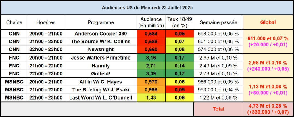 Audiences des chaines infos : FOX News en forte hausse et repasse les 3M à 20h et à 22h. Newsnight en hausse à 22h sur CNN. Le 22h de MSNBC également en belle hausse.