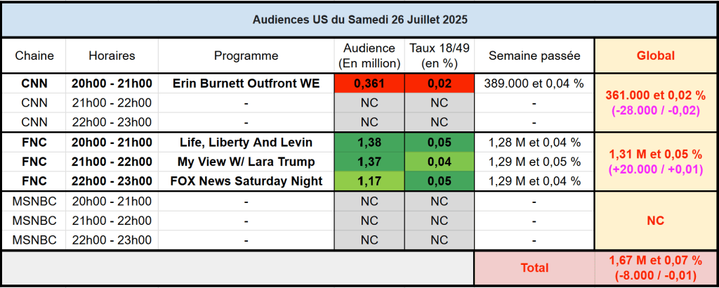 Audiences des chaines infos : FOX News domine largement la « non concurrence » de ce samedi. Petite baisse de régime tout de même pour FOX News Saturday Night.