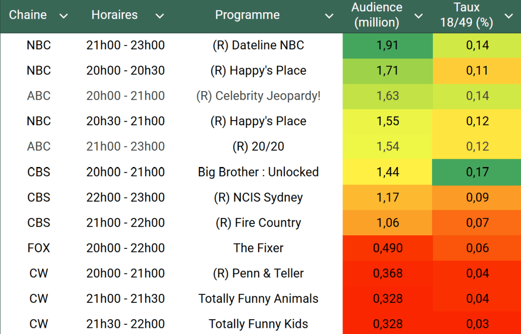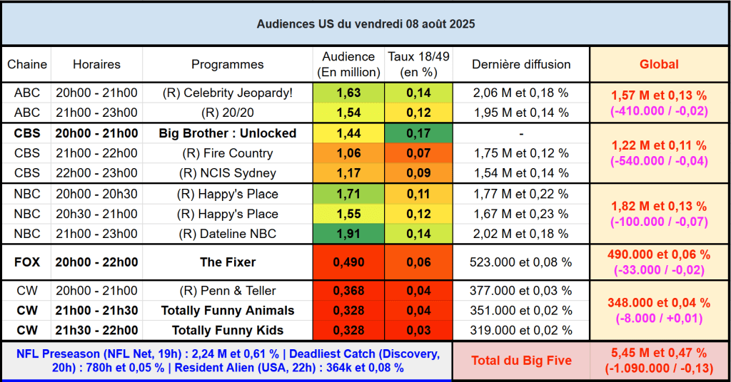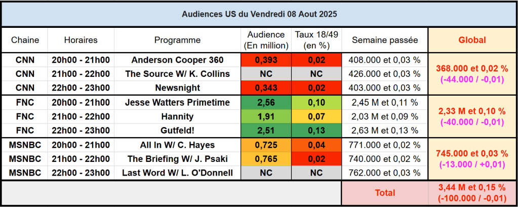 Audiences des chaines infos : Les chaines infos sont aussi en souffrance ce vendredi. FOX News reste bon leader, mais Hannity passe sous les 2M. CNN est nettement sous les 400k et MSNCB sous les 800k.