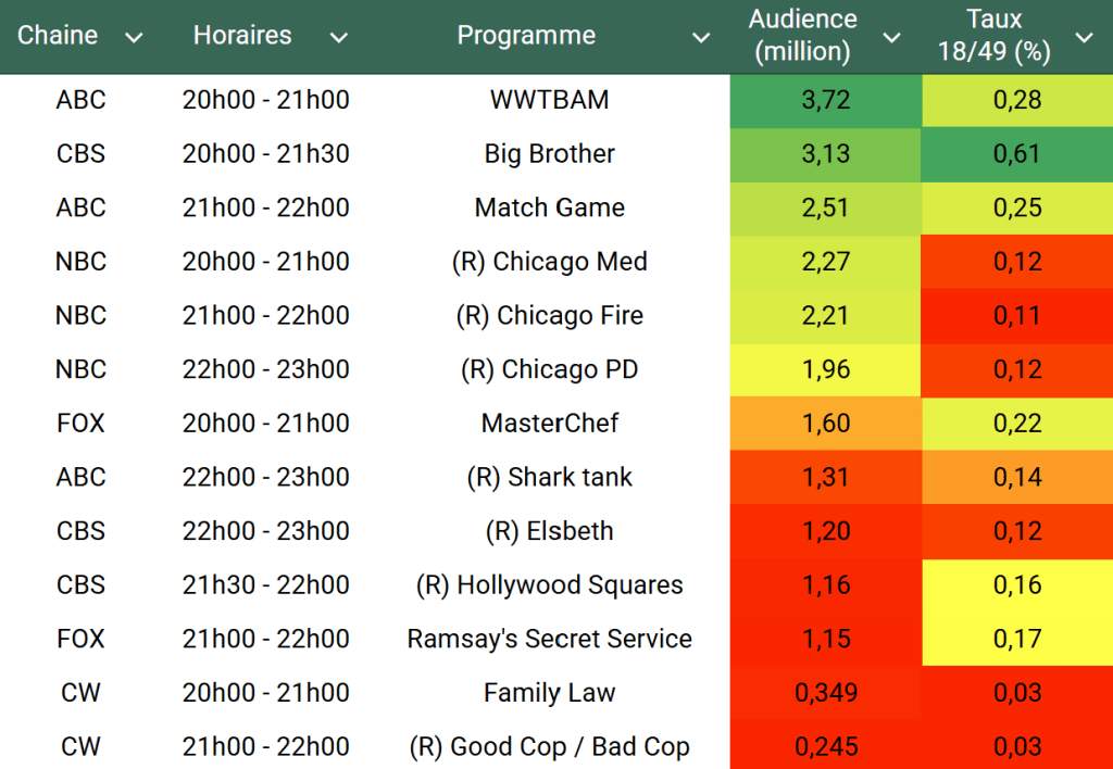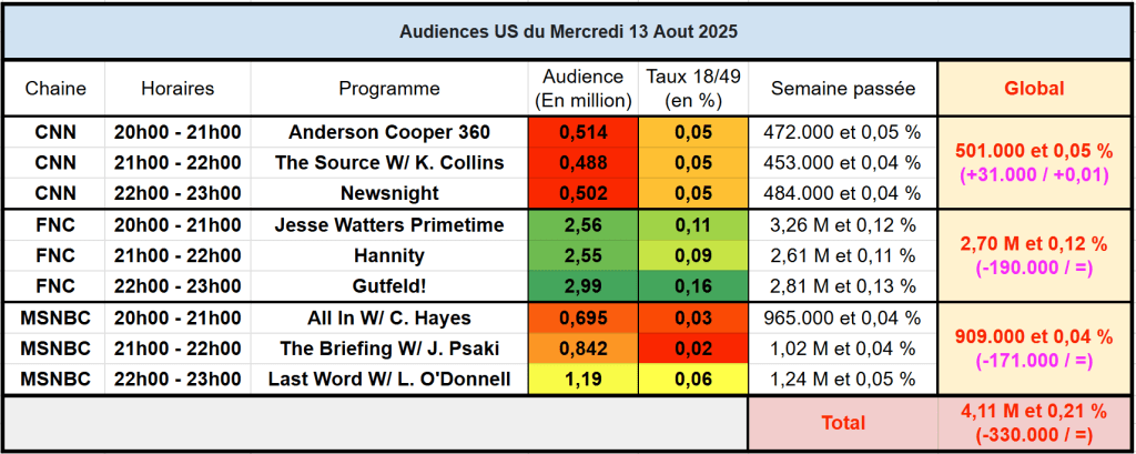 Audiences des chaines infos : FOX News leader en baisse, mais Gutfeld! est toujours puissant à 22h avec presque 3M. MSNBC repasse sous le million, quand CNN repasse les 500k.