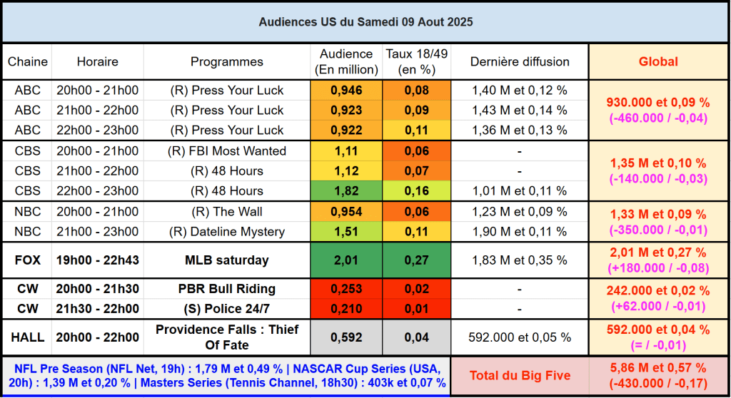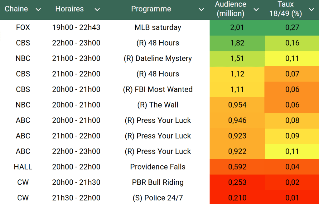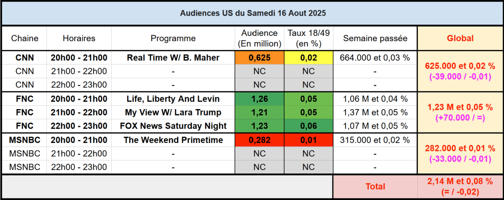 Audiences des chaines infos : FOX News domine largement, ses 3 émissions au dessus du million, comme toujours. Peu d’audiences disponibles pour MSNBC et CNN le samedi (les 21h/23h doivent être très faible sur cible, inférieur à 0,01%)