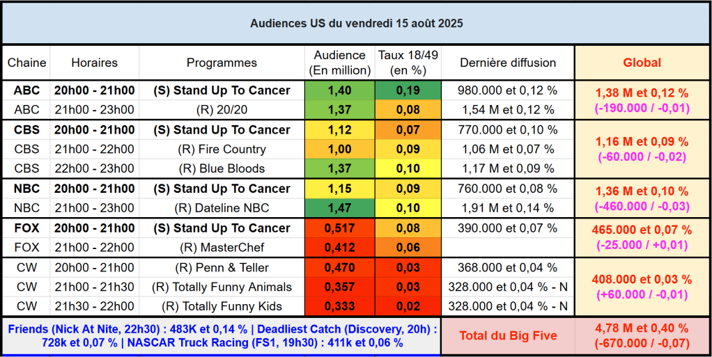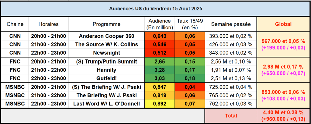 Audiences des chaines infos : FOX News au top pour un vendredi, avec la rencontre Trump/Poutine. Carton pour Hannity et Gutfeld! qui dépassent les 3M. FOX News gagne 650k sur une semaine et se classe leader national sur les 3h de prime. CNN et MSNBC connaissent aussi une augmentation mais moins prononcée. CNN sous les 600k et MSNBC sous les 900k en moyenne.