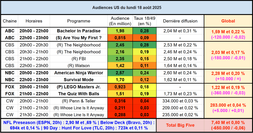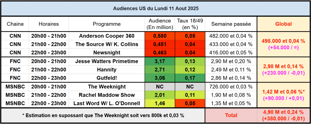 Audiences des chaines infos : Avec l’actualité politique et internationale, FOX News signe une très belle hausse et une très belle soirée en dépassant les 3M à 20h et 22h. Rachel Maddow Show dépasse les 2M.