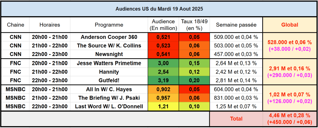 Audiences des chaines infos : FOX News au top. Gutfeld! atteint les 0,20% sur cible, puissant pour une chaine info. CNN et MSNBC progressent aussi.