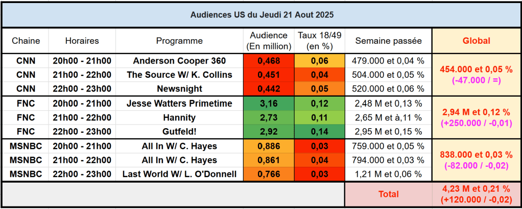 Audiences des chaines infos : FOX News très large leader, en belle hausse, c’est d’ailleurs la seule chaine info en hausse.
