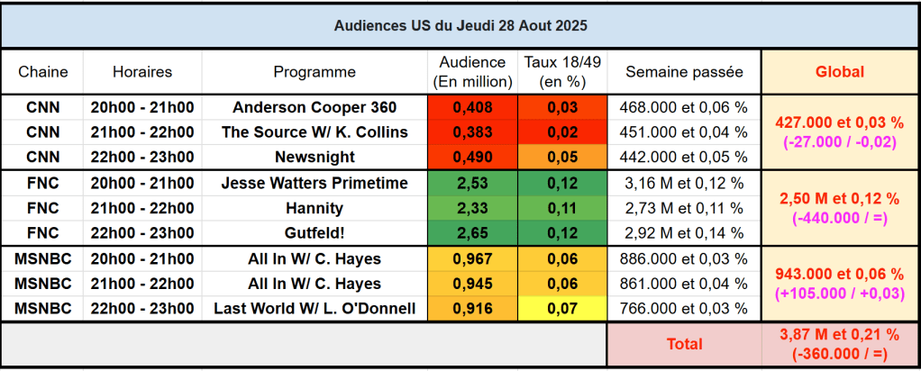 Audiences des chaines infos : FOX News large leader mais en nette baisse.