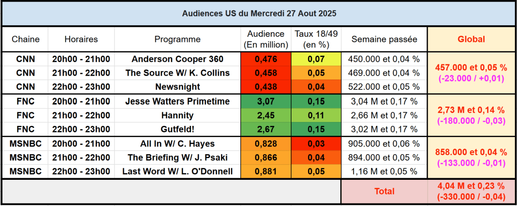 Audiences des chaines infos : FOX News large leader en baisse. Jesse Watters Primetime au dessus des 3M. CNN et MSNBC également en recul.