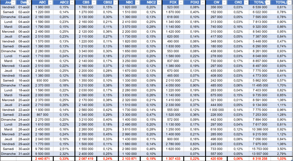 Moyennes des audiences primes (téléspectateurs et cible 18/49 ans) de ABC, CBS, NBC, FOX et CW en Aout 2025