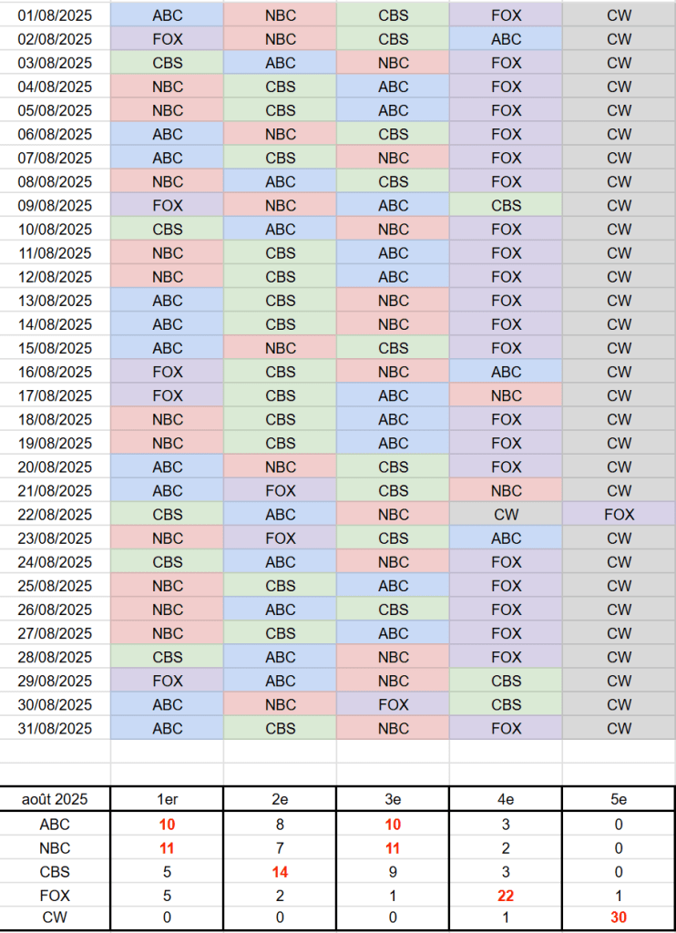 Comme en Juillet, c’est NBC qui domine le nombre de soirées dominées avec 11 leaderships, un record pour NBC en 2025