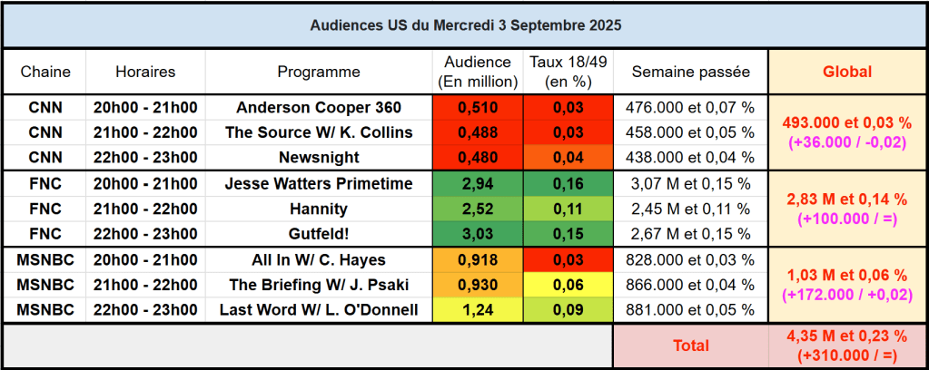 Audiences des chaines infos : FOX News très large leader, dépasse les 3M à 22h. MSNBC repasse la barre du million. CNN en légère progression.