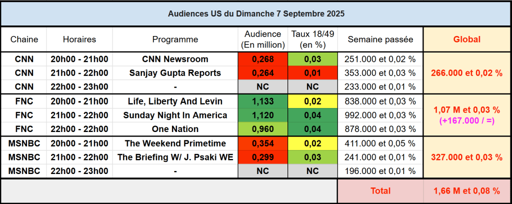 Audiences des chaines infos : FOX News repasse au dessus du million sur la moyenne 20h/23h., toujours nettement devant ses concurrents.
