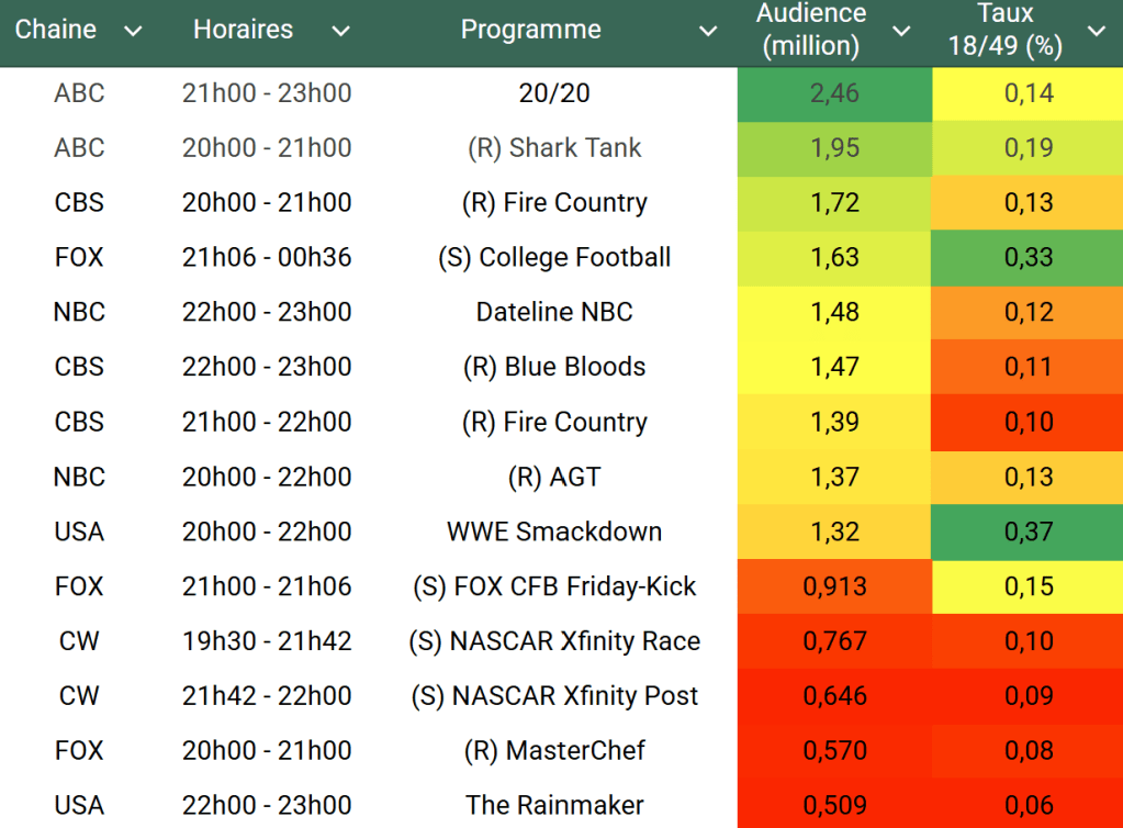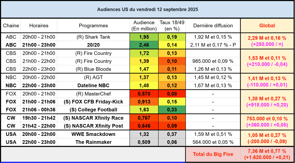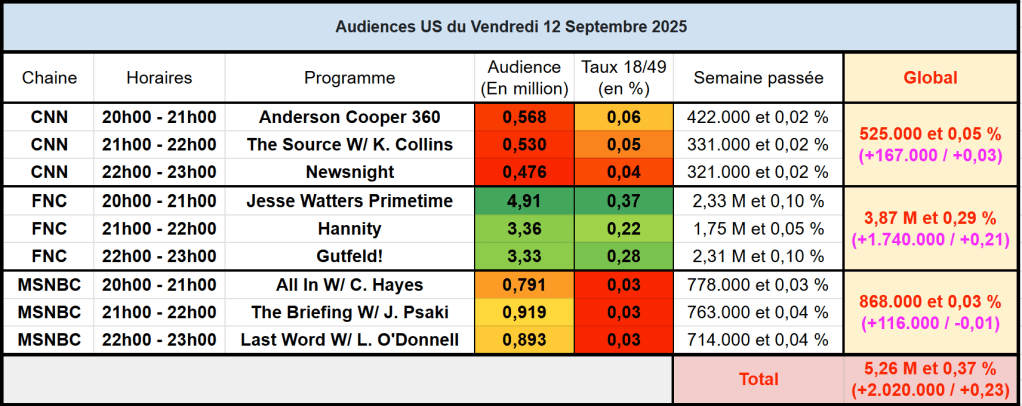 Audiences des chaines infos : FOX News toujours au top avec l’affaire Charlie Kirk, Jesse Watters approche les 5 millions à 20h, et en plus un vendredi (performance plus basse que Lundi-jeudi d’habitude). Sur cette tranche, MSNBC est à 791k et CNN est à 568k, un gouffre énorme avec FOX News.