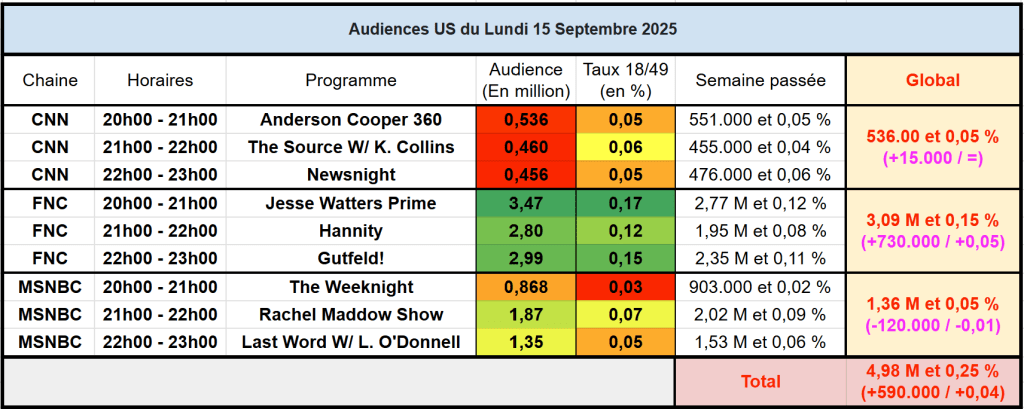 Audiences des chaines infos : FOX News retrouve ses bons niveaux après deux lundis plus faible. Jesse Watters dépasse facilement les 3 millions.