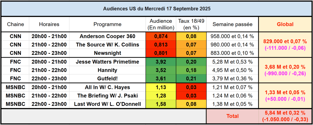 Audiences des chaines infos : La semaine dernière, l’actualité était marquée par l’assassinat de Charlie Kirk, donc forcément FOX News est en forte baisse. Cependant, FOX News, CNN et MSNBC restent bien au dessus de leur moyenne. Jesse Watters frôlant les 4M.