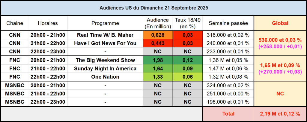 Audiences des chaines infos : FOX News muscle son jeu, et The Big Weekend show réalise un excellent score en approchant les 2 millions et dépassant les 0,10 % sur cible. Bonne soirée pour CNN sur son 20h/22h.