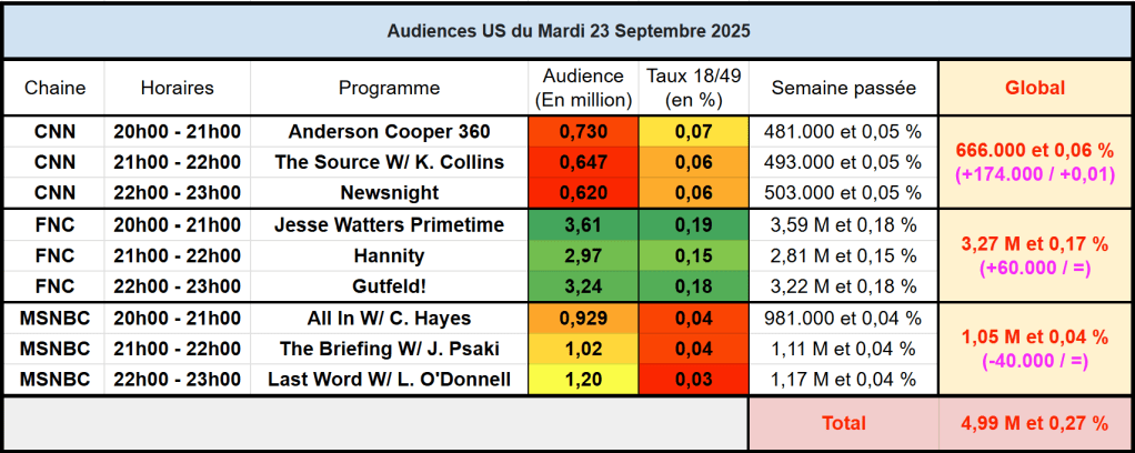 Audiences des chaines infos : FOX News en très belle forme atteint 3,61 M et 0,19% avec Jesse Watters. CNN aussi en forme, au dessus des 700k à 20h.