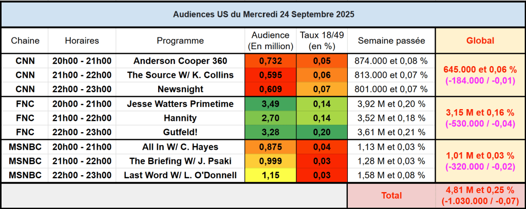 Audiences des chaines infos : FOX News large leader en baisse. CNN et MSNBC suivent la même tendance.