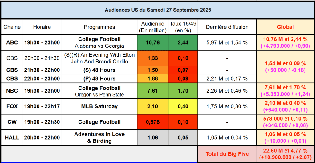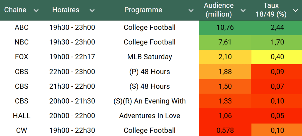 Audiences des chaines infos : FOX News souffre de la concurrence du College Football sur ABC et NBC et subit une nette baisse.
