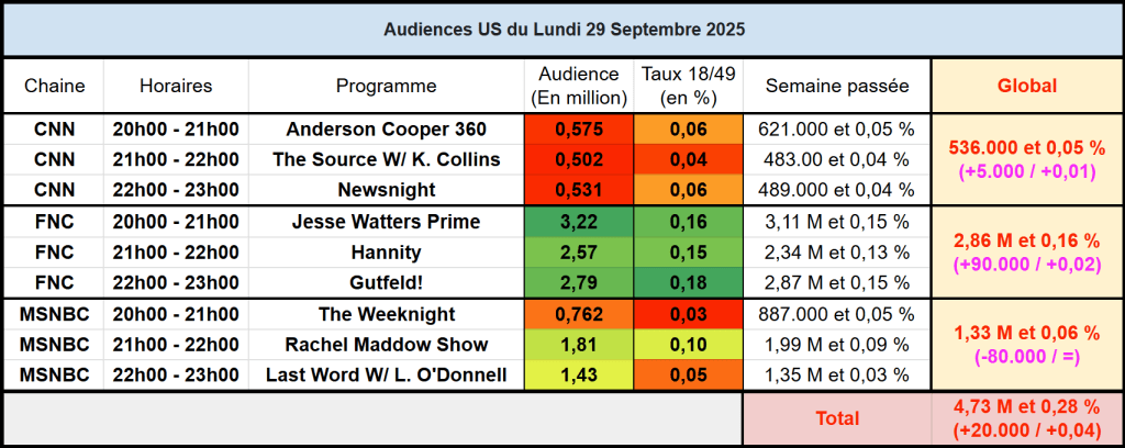 Audiences des chaines infos : FOX News très large leader en hausse. Jesse Watters Primetime toujours au dessus des 3 millions.