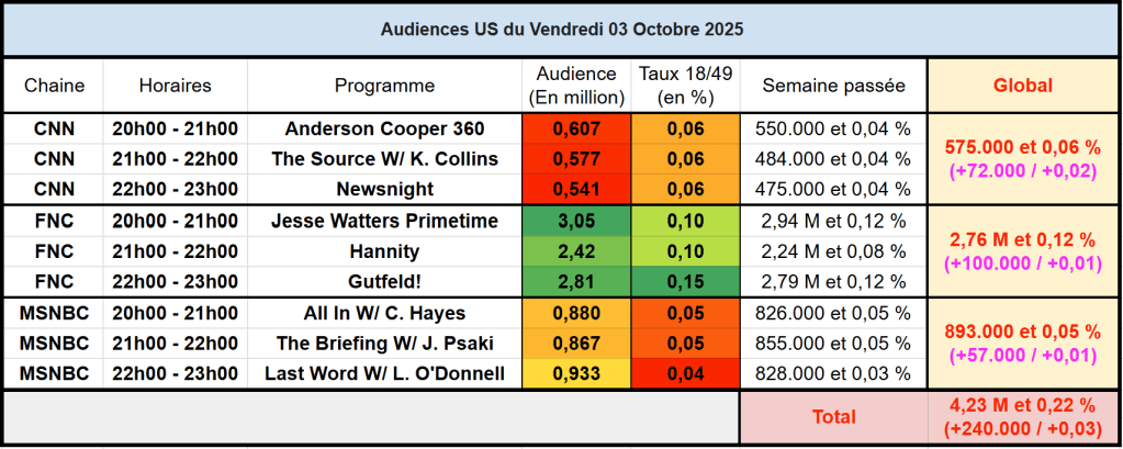 Audiences des chaines infos : FOX News encore et toujours large leader, en hausse. CNN et MSNBC progressent aussi.
