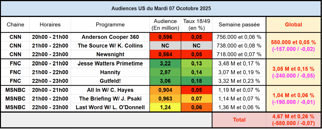 Audiences des chaines infos : Toutes les chaines infos sont en nette baisse sur une semaine. FOX News reste très large leader.