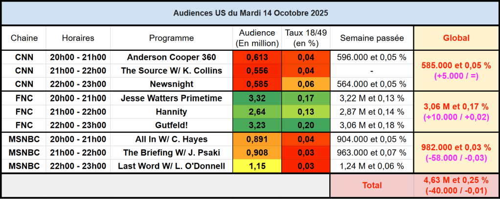 Audiences des chaines infos : FOX News leader au top. CNN stable. MSNBC en baisse et faible sur cible.