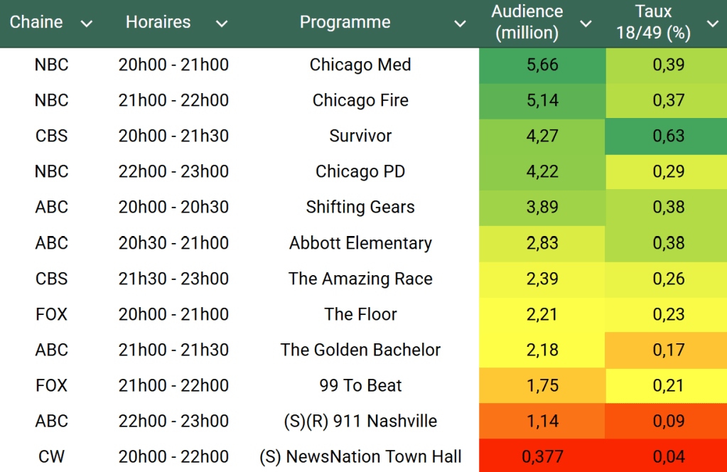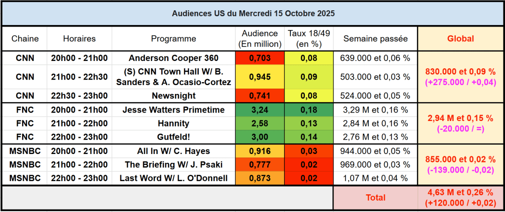 Audiences des chaines infos : CNN Town Hall booste CNN, pas assez pour inquiéter FOX News qui reste large leader, mais assez pour talonner MSNBC et être largement devant sur cible. MSNBC qui signe une très mauvaise semaine.