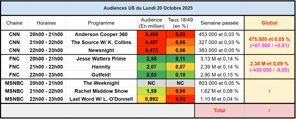 Audiences des chaines infos : FOX News en forte baisse. CNN progresse.