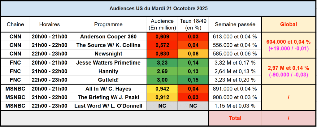Audiences des chaines infos : FOX News leader, tout juste sous les 3 millions. Bonne soirée pour CNN.