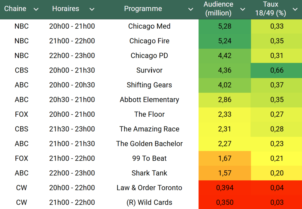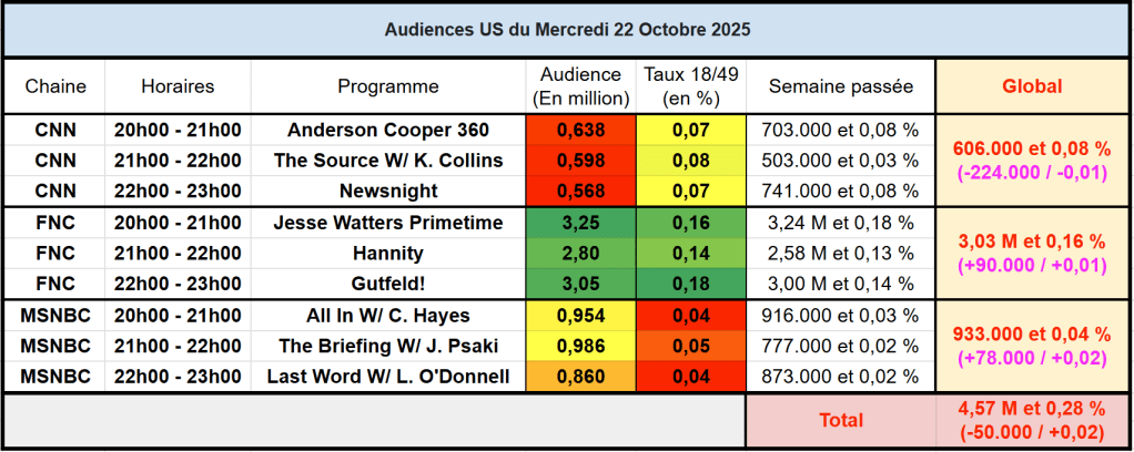 Audiences des chaines infos : FOX News leader au dessus des 3 millions. Bonne soirée aussi pour CNN (baisse par rapport à l’émission spéciale) MSNBC reprend des couleurs mais reste bloquée sous le million.
