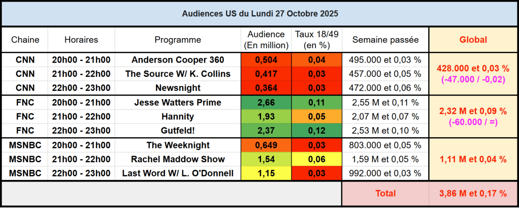 Audiences des chaines infos : FOX News leader en baisse. CNN pas en super forme non plus.
