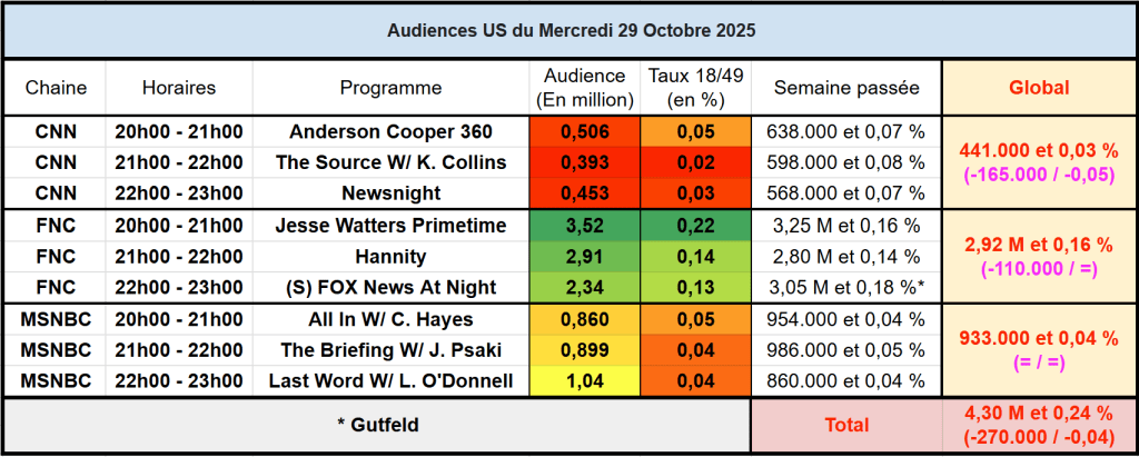 Audiences des chaines infos : FOX News leader en très belle forme sur son 20h/22h.