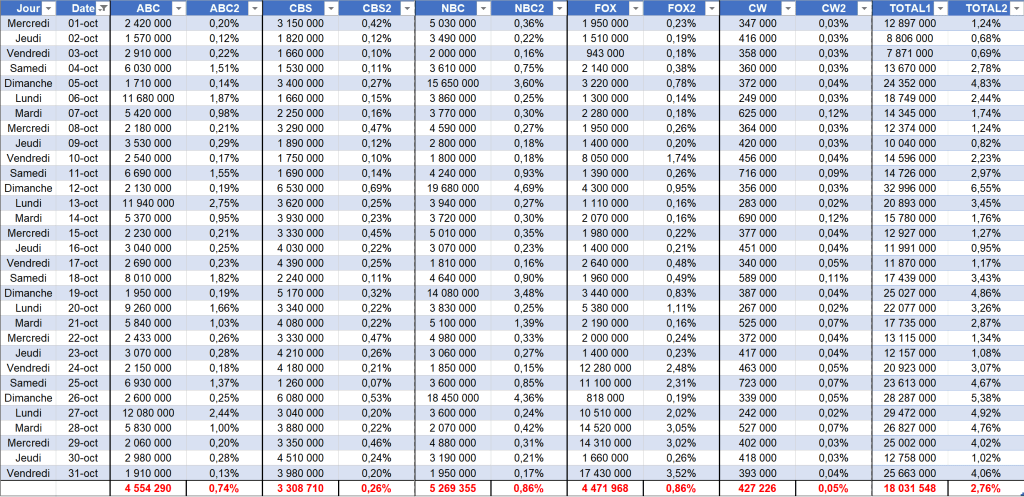 Avec les différents match de baseball, et 6 match de World Series sur la fin du mois, FOX explose en octobre et signe un score très puissant. FOX gagne 2,86 M et 0,59 pts par rapport à septembre.
